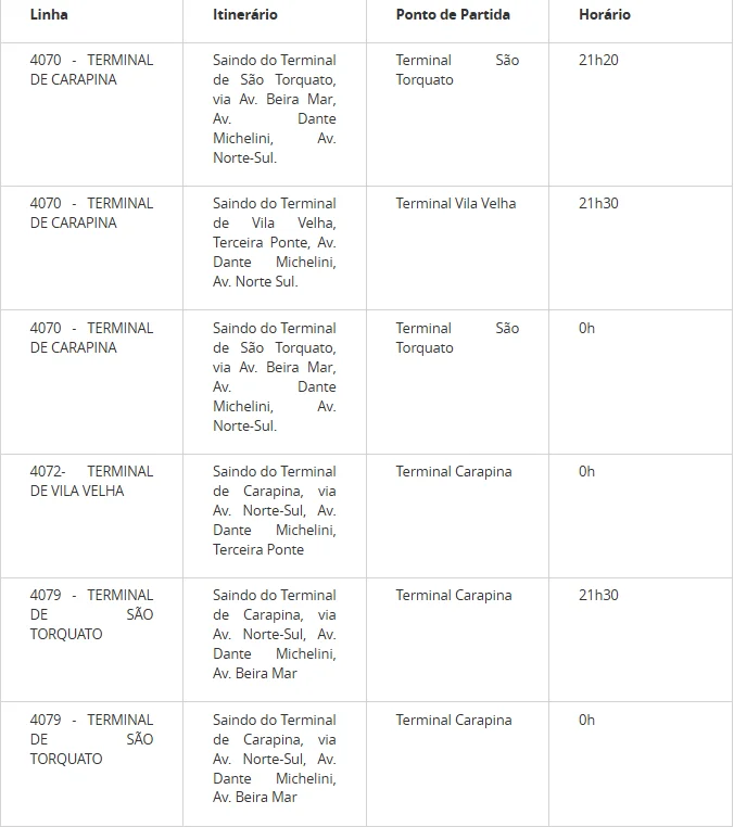 Para o Aniversário de Vitória, entre os dias 5 e 7 de setembro, além da madrugada de segunda-feira (8), haverá reforço com horários extras em quatro linhas:
