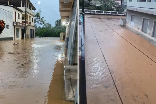 Rio Iconha atinge 3,5 metros e transborda no centro da cidade, alagando três ruas nesta sexta (27); água já começou a baixar e não há registro de desabrigados.