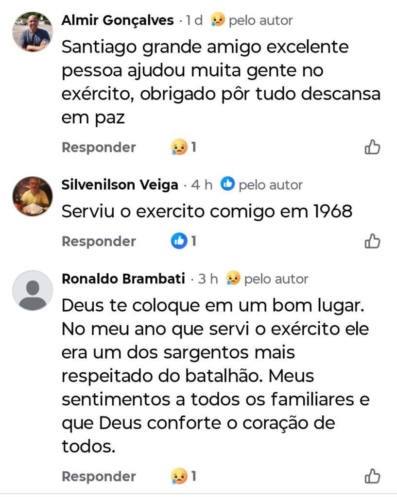 De acordo com relatos da família, a partida do militar foi marcada por serenidade. Em seus momentos finais, Santiago demonstrou a fé que o acompanhou por toda a vida: “Com semblante sereno, ele levantou os dois braços para o céu e disse que o Senhor tinha vindo buscá-lo. Após isso, respirou fortemente por três vezes, fechou os olhos e faleceu”, narrou um familiar.