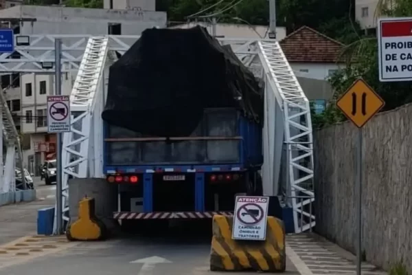 Caminhão de grande porte ignora sinalização e fica preso ao tentar acessar ponte com restrição em Colatina.