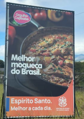 Outdoor da campanha “Orgulho Capixaba” gerou polêmica ao usar foto de carne para ilustrar a famosa moqueca; Governo admitiu erro e removeu as placas.